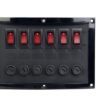 Zwart schakelpaneel met 6 verlichte schakelaars en 6 zekering houders.